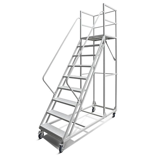 This mobile ladder for high-altitude work is designed for safety and efficiency. Its robust construction and easy-to-move base make it the perfect choice for reaching elevated areas while maintaining a stable and secure working environment.